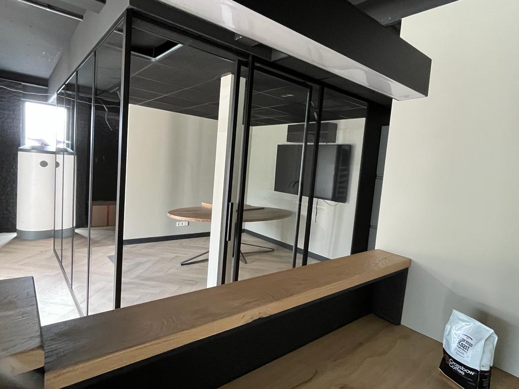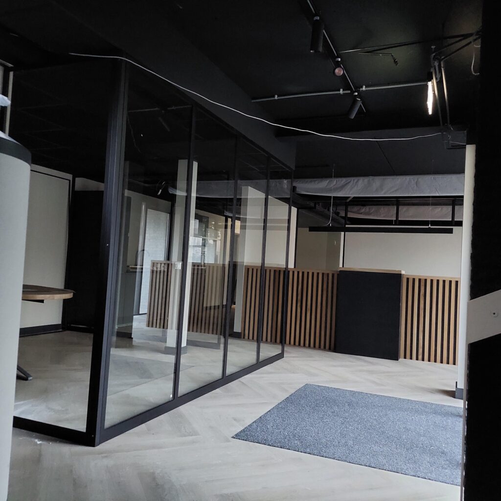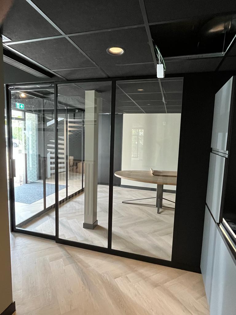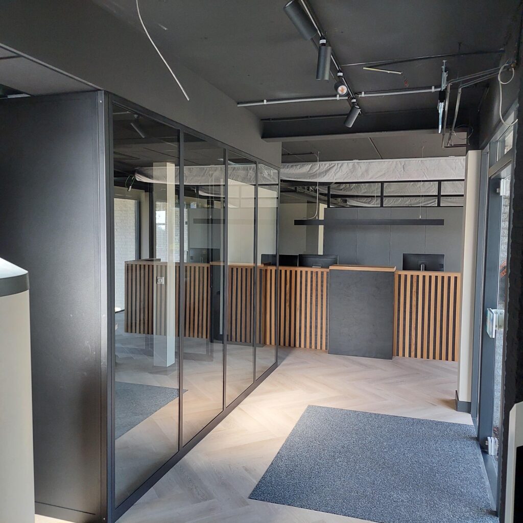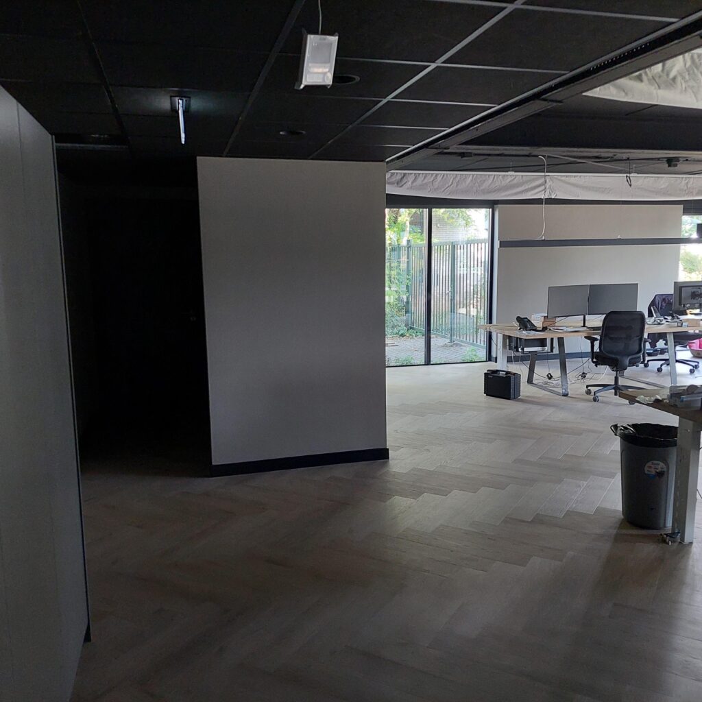 Alles super strak en geheel naar deze tijd ingericht. De ene helft van de plafonds zwart gespoten, zodat je een industriële look blijft houden en de andere helft bekleed met zwarte systeemplafondplaten, wat voor een uiterst strakke uitstraling zorgt. Ook zorgen de glazen puien tussen de entree en het kantoor voor een enorm ruimtegevoel, omdat je in 1 oogopslag door het hele kantoor heen kijkt. Kortom, een uiterst strak plaatje en enorm tevreden klanten achtergelaten.