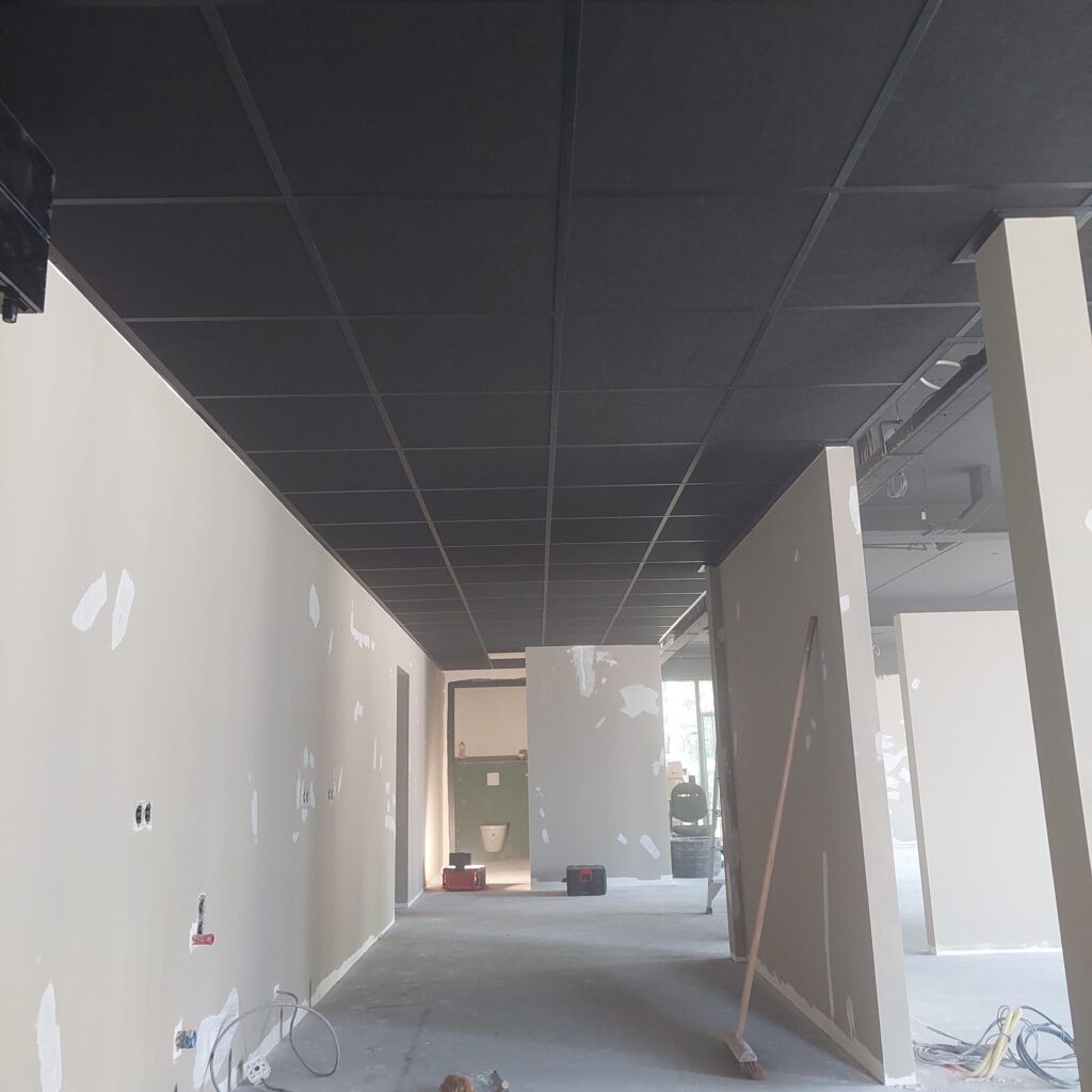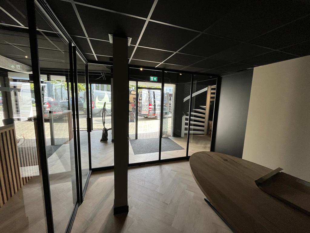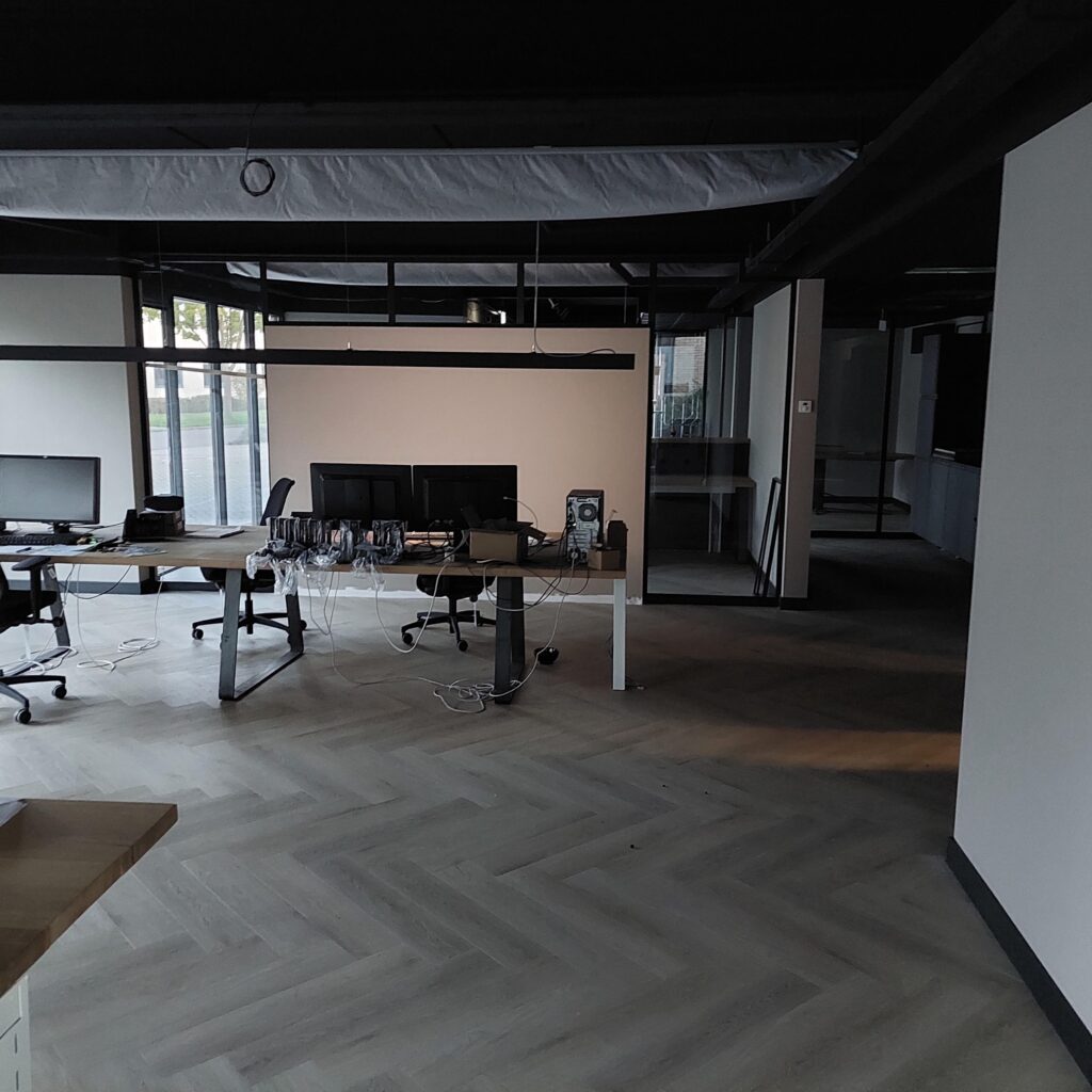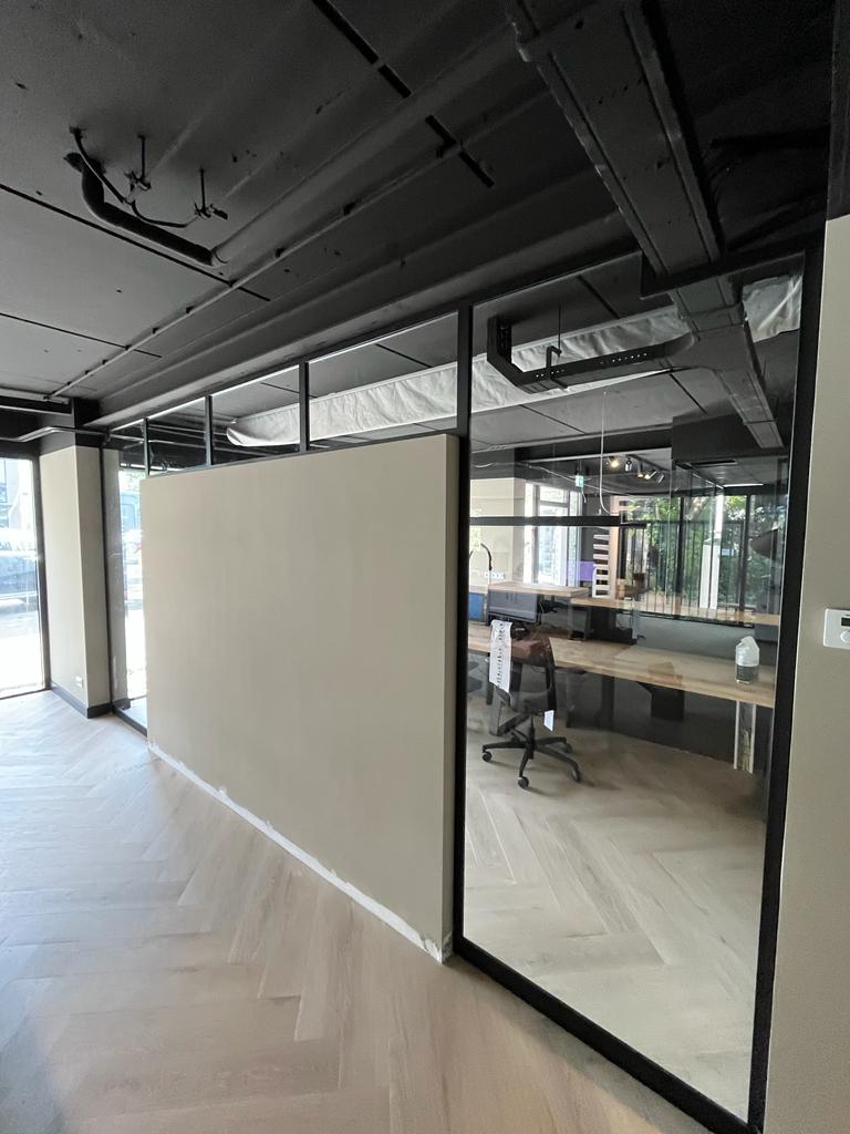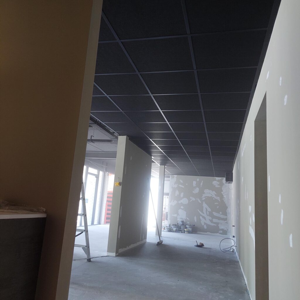 Alles super strak en geheel naar deze tijd ingericht. De ene helft van de plafonds zwart gespoten, zodat je een industriële look blijft houden en de andere helft bekleed met zwarte systeemplafondplaten, wat voor een uiterst strakke uitstraling zorgt. Ook zorgen de glazen puien tussen de entree en het kantoor voor een enorm ruimtegevoel, omdat je in 1 oogopslag door het hele kantoor heen kijkt. Kortom, een uiterst strak plaatje en enorm tevreden klanten achtergelaten.